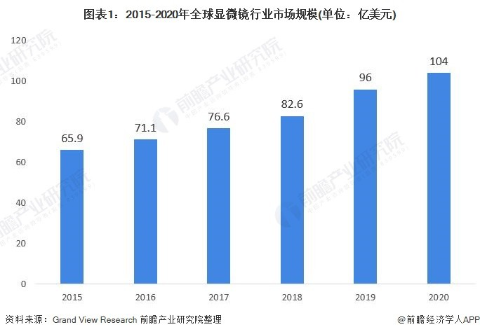 目前显微镜制造行业已逐步进入商业化成熟期,全球显微镜制造行业稳步增长,而技术的创新是显微镜制造行业的不断增长的核心动力。根据Grand View Research数据显示,2019年全球显微镜市场规模约为96亿美元,2020年全球显微镜市场规模已经突破了100亿美元。