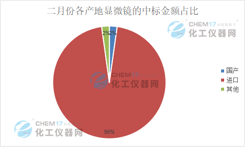 从中标显微镜的产地来看,可统计到产地的显微镜中标数量共114套,其中,国产显微镜共中标61套,中标总金额约为146.7万元,中标数量约占2月份显微镜中标总数量的52%,中标金额约占2月份显微镜中标总金额的2%。从平均单价看,进口显微镜在2月份中标的平均单价约为119.48万元/套,国产显微镜约为2.4万元/套,进口显微镜平均单价约是国产显微镜的49.8倍。